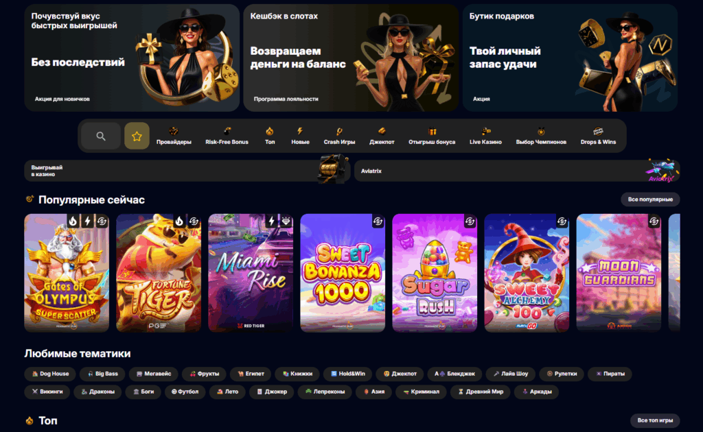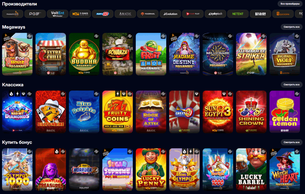 - Слоты: Классические трехбарабанные аппараты, современные видеослоты с 5+ барабанами, игры с механиками Megaways и каскадными символами.