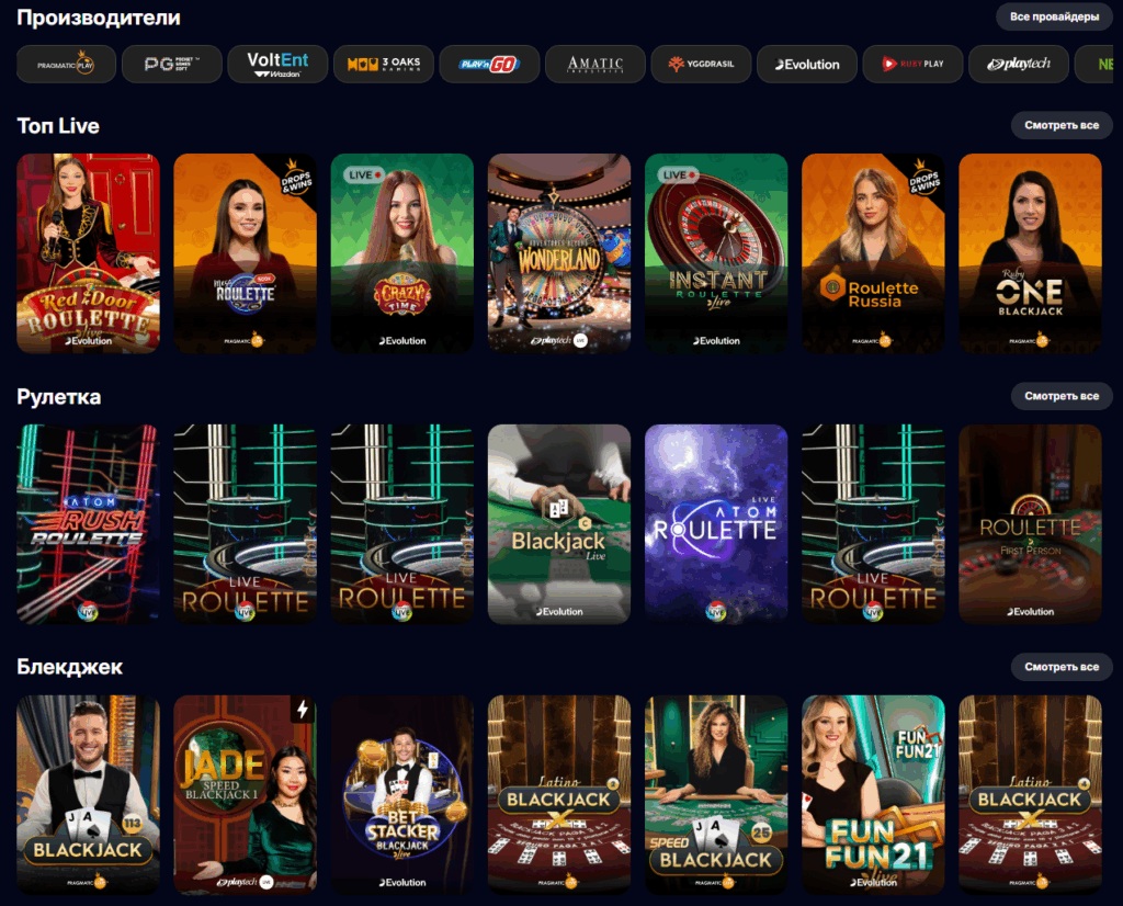 - Лайв-казино: Игры с реальными дилерами в режиме реального времени: рулетка, блэкджек, баккара, кэш-шоу и покер.